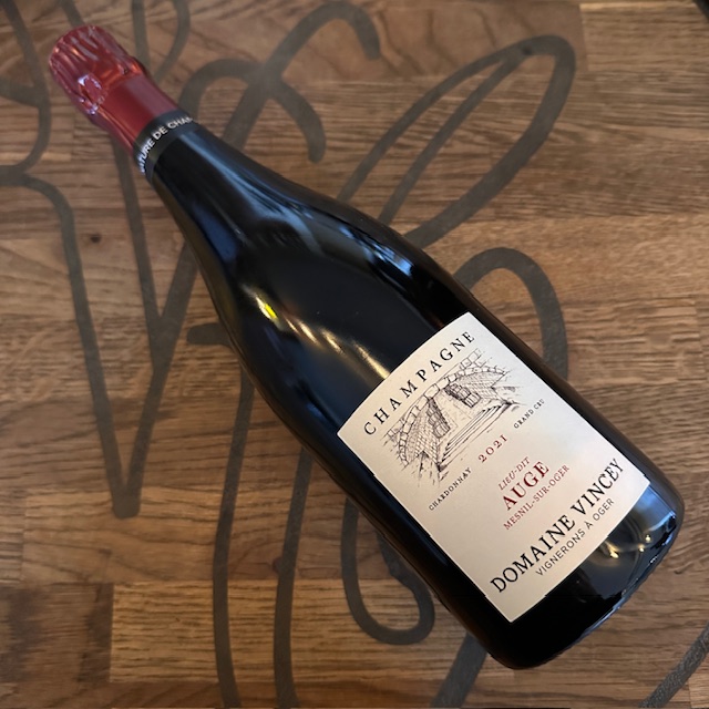 Auge 2021 fra Domaine Vincey i Oger Grand Cru i Côte des Blancs. Den er lavet på 100% Chardonnay og vinificeret i neutrale fade, hvilket giver lidt ekstra tekstur uden tydelig fadsmag. Stilen er meget præcis og terroir-drevet, med citrus, æble og den klassiske kalkede mineralitet fra området
