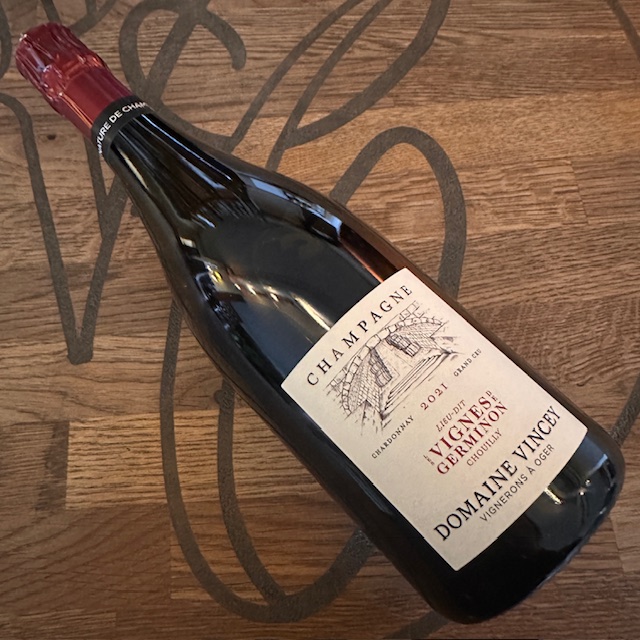 Domaine Vincey Les Vignes de Germinon 2021 er en enkeltmarks Blanc de Blancs fra Chouilly Grand Cru. Den er lavet på gamle Chardonnay-stokke og tappet uden dosage, hvilket giver en knivskarp og terroir-drevet stil. I glasset finder man citrus, hvide blomster og kridtet mineralitet, med en stram, salt finish og en elegant, næsten elektrisk energi.